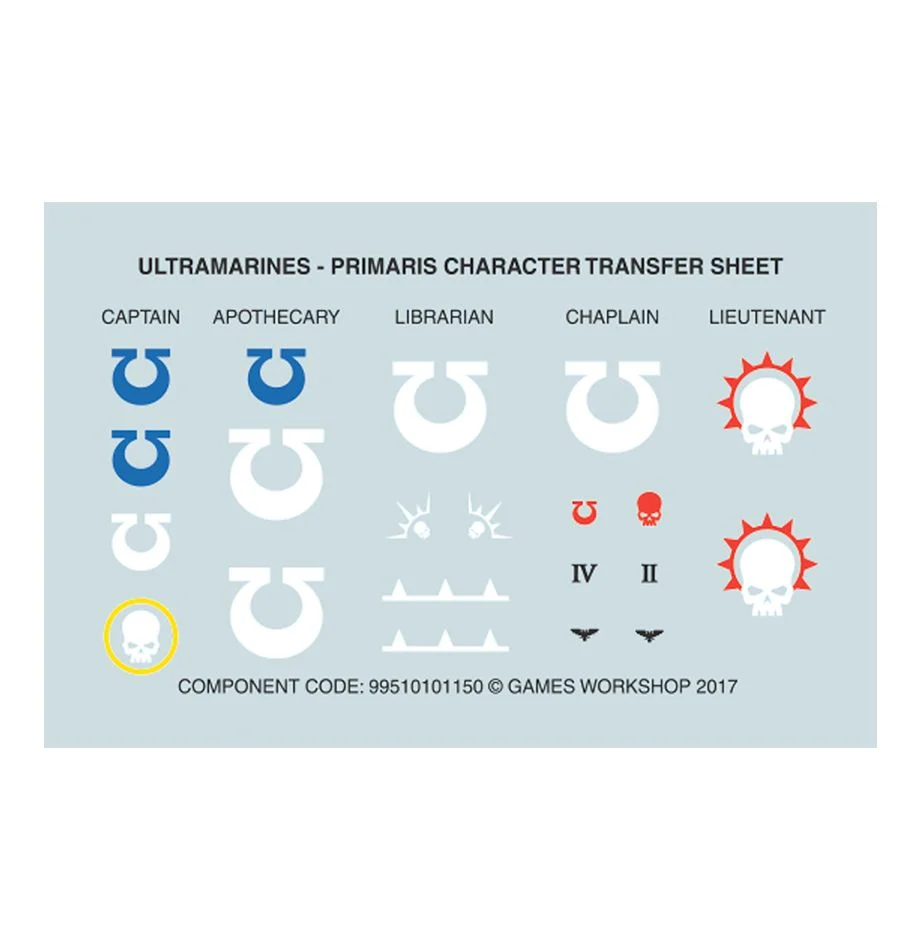 Il Primaris Librarian è formato da 20 componenti ed è fornito con una basetta Citadel rotonda da 40mm. Il kit include anche un foglio di trasferibili dei Personaggi degli Ultramarines, incluse le icone per Captain, Chaplain, Librarian e Lieutenant.
